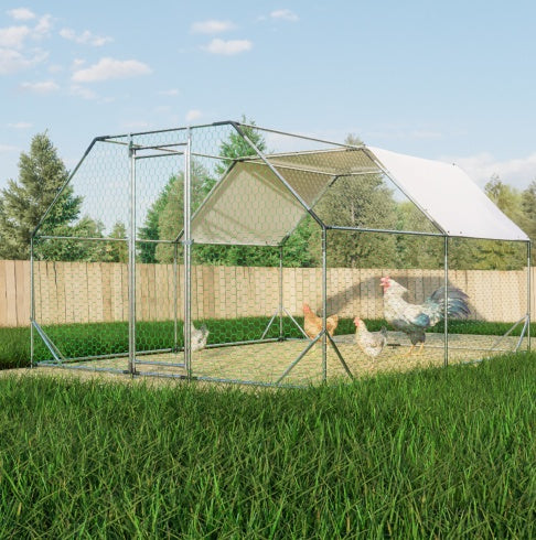 - A durable UV and water-resistant tarp can protect your chicken from the weather and outside elements. The pitched roof allows water, debris, and light snow to easily run off instead of accumulating.