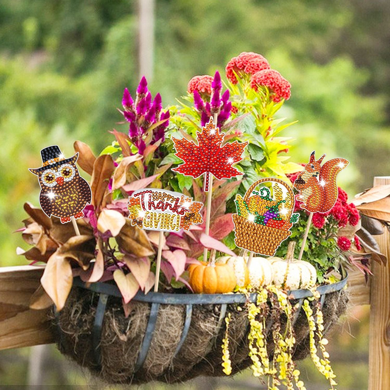 12 Packs Rhinestones Painting Art Kit Fall Pumpkin Turkey Maple Corn Design Decorative Stakes For Vase DIY 5D Rhinestones Art Craft Ornaments With Glue And Suction Cup For Thanksgiving Harvest Decor