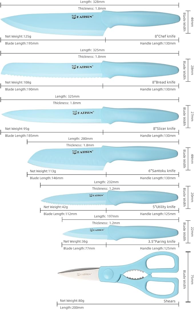 - 【Ergonomic Handles】The kitchen knives sets handles are made from durable and comfortable High quality plastic, featuring a striking blue color that will brighten up your kitchen. Say goodbye to hand fatigue and hello to efficient, stylish slicing
