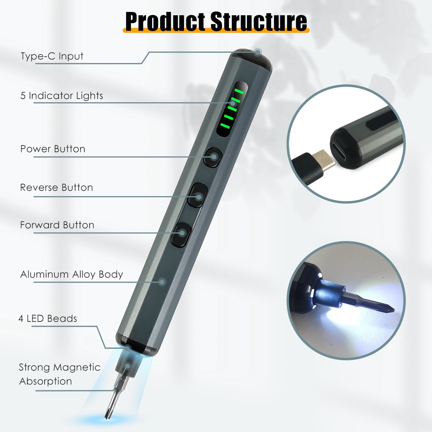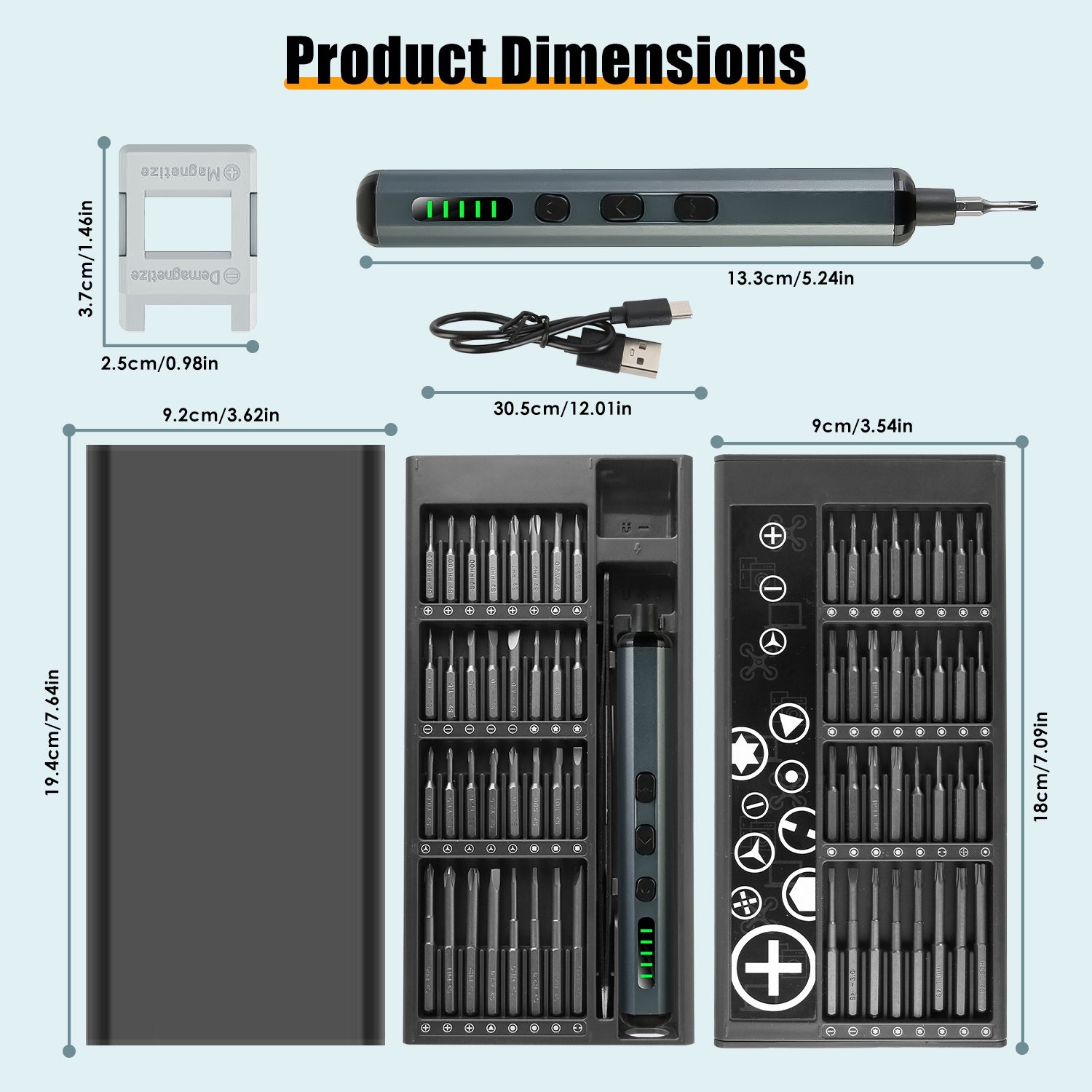- Materials: ABS Case; S2 Carbon Steel Bits; Aluminum Alloy Screwdriver Handle; ABS Magnetizer & Demagnetizer