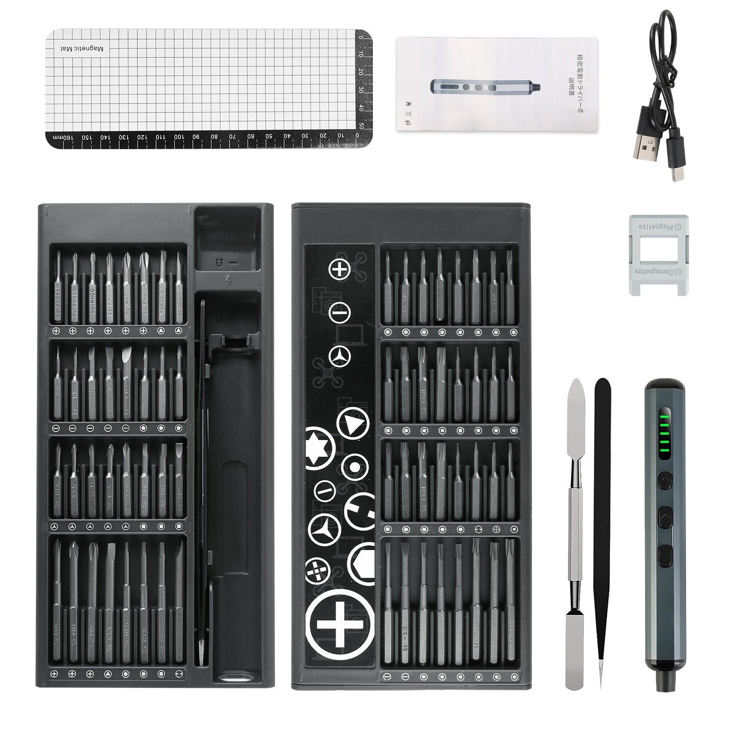- *70-IN-1 Repair Tool Kit*: This mini screwdriver set includes 70 pieces:1x Electric Screwdriver Handle,1x Storage Case,1x Type-C USB Cable,1x Magnetizer & Demagnetizer,1x Pointed Tweezers,1x Metal Spudger,1x Magnetic Mat,64x Magnetic Bits,meeting your daily repairing needs.