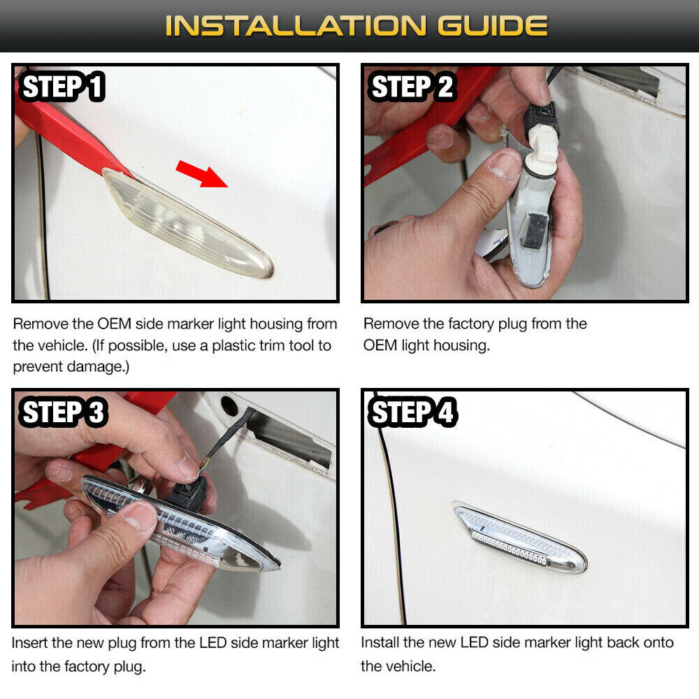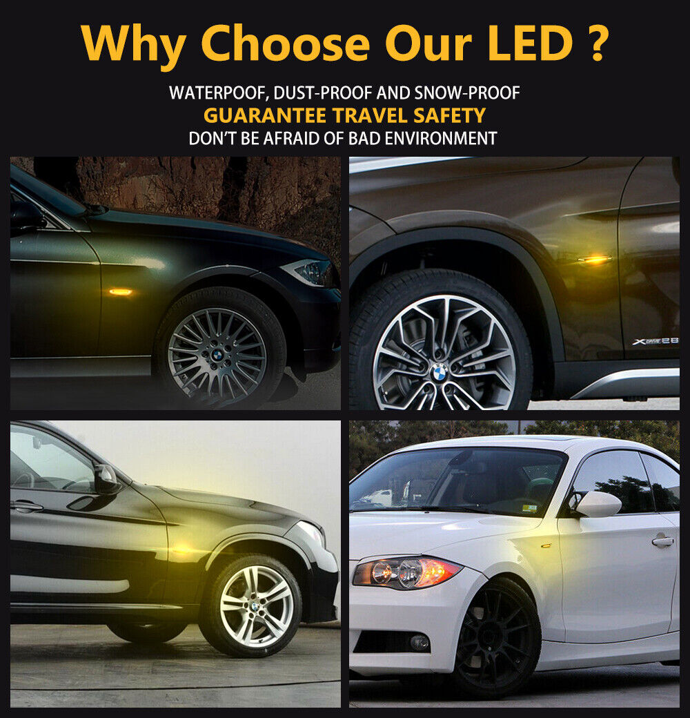 Upgrade your BMW E90, E91, or E93 with these premium smoke LED side marker turn signal lights. Engineered for seamless OEM fitment, these replacements deliver enhanced visibility while maintaining your vehicle's sleek aesthetic. The LED technology provides superior brightness and longevity compared to standard bulbs, ensuring reliable performance in all driving conditions. Easy installation with no modifications required. Perfect for restoring worn markers or achieving a modern, cohesive look. Includes both driver and passenger side units for complete coverage.