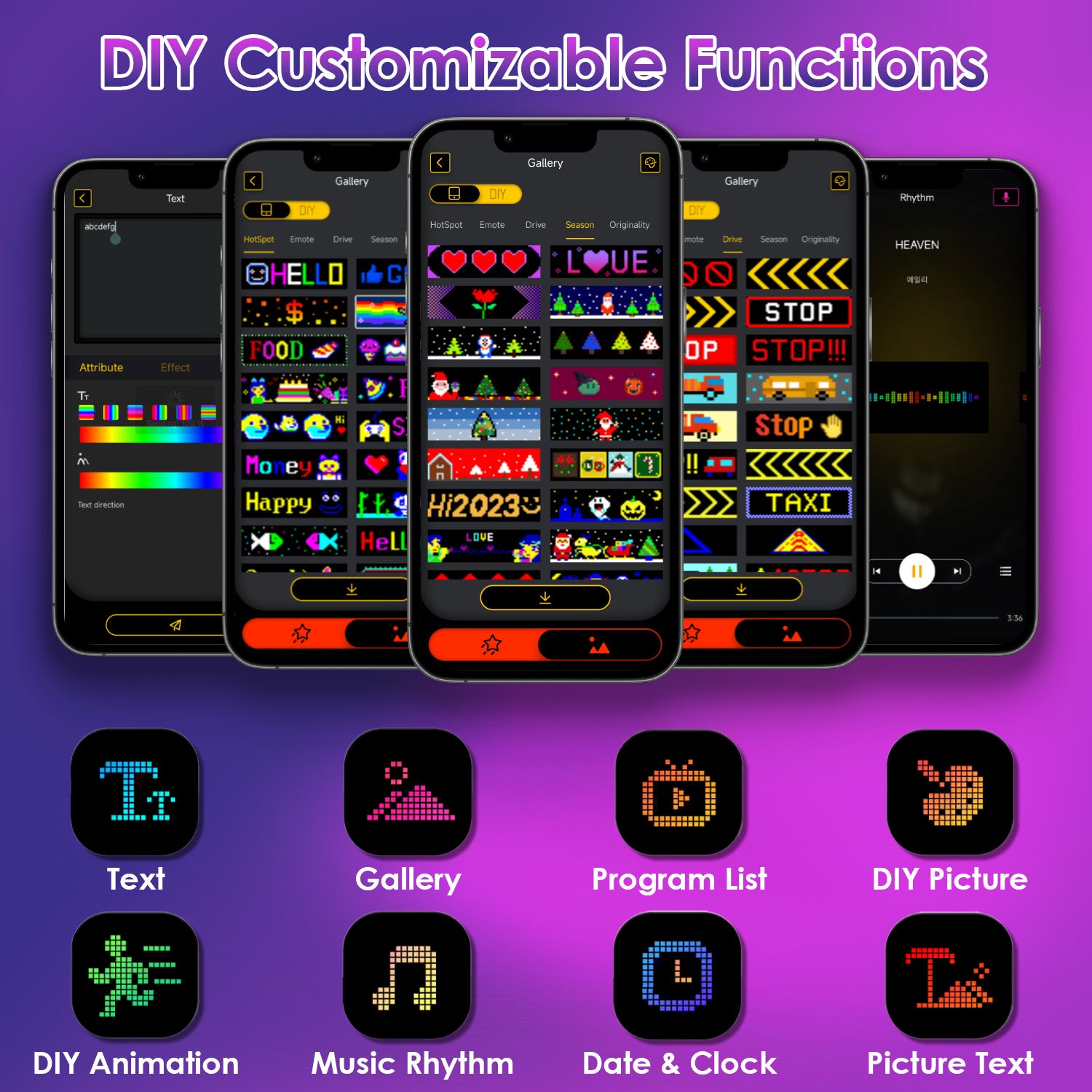 - APP Programming: Text, Gallery, Program List, DIY Picture, DIY Animation, Remote Control, Music Rhythm, Date & Clock, Picture Text, Settings