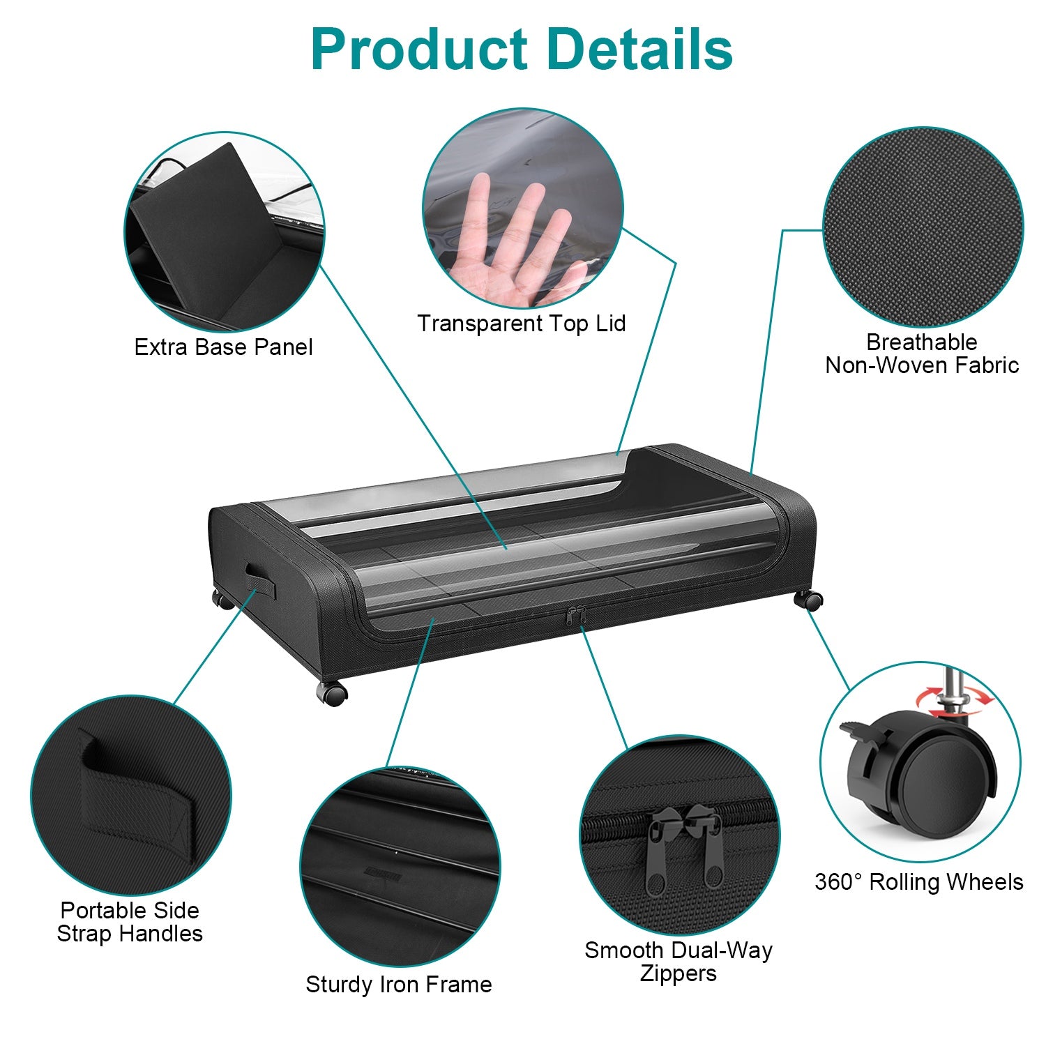 - *360° Lockable Rolling Wheels*: Equipped with 4 360° smooth wheels and 2 side strap handles,which allow the under bed containers to effortlessly quickly gliding in and out underneath bed when in use. With lock function on 2 wheels,simply make the storage bin stay still when place under the bed. Just press the locking mechanism lightly to lock and pull it up to unlock.