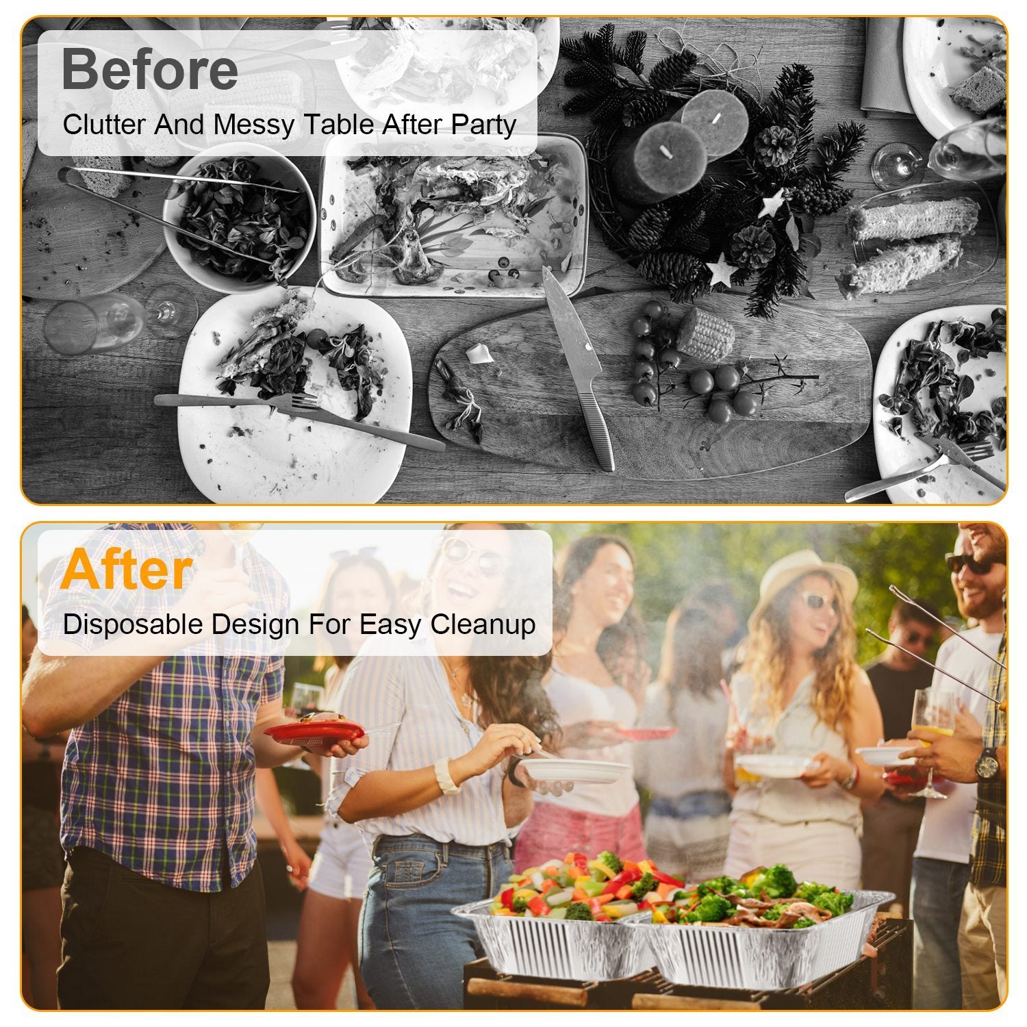 - Quick Setup & Easy Cleaning: Cleaning job has always being a headache after a lively party. With its easy setup and efficient design, our disposable chafing dish buffet set makes clean-up stress-free, saving your valuable time and effort to fully immerse yourself in the joy of gathering with family and friends.