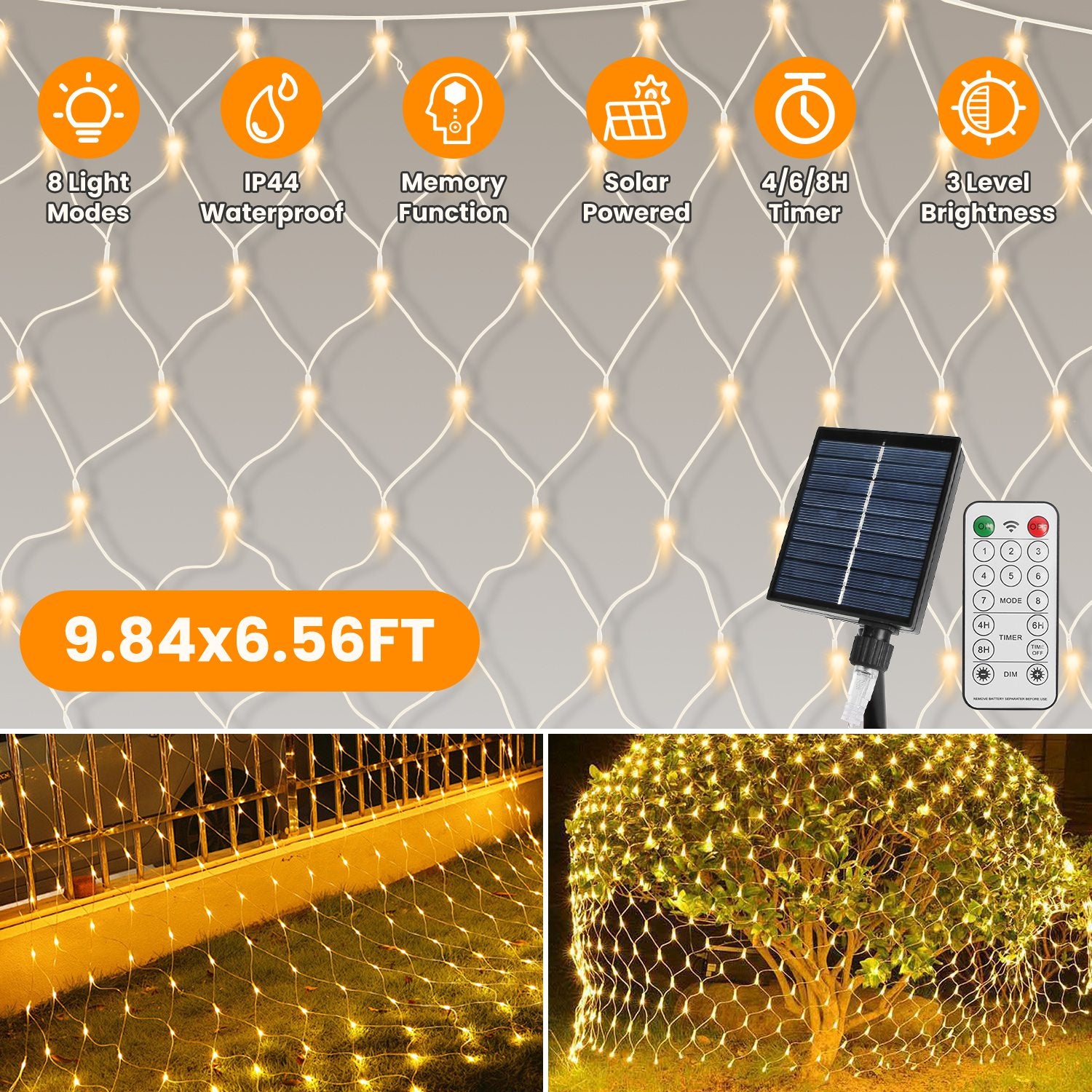 - * Net Light for Every Holiday & Decor *: Measuring 9.84 × 6.56 ft with 16 strands and 192 warm yellow LED beads,this solar net light is perfect for year-round decorating. Whether it's the twinkling charm of Christmas,the romantic glow for Valentine’s Day,the celebratory spirit of New Year,the elegance of a wedding,the vibrancy of parties,or simply enhancing the beauty of your garden,yard,or shop,this solar net light is the perfect choice. It instantly adding a warm,enchanting ambience for every scene!