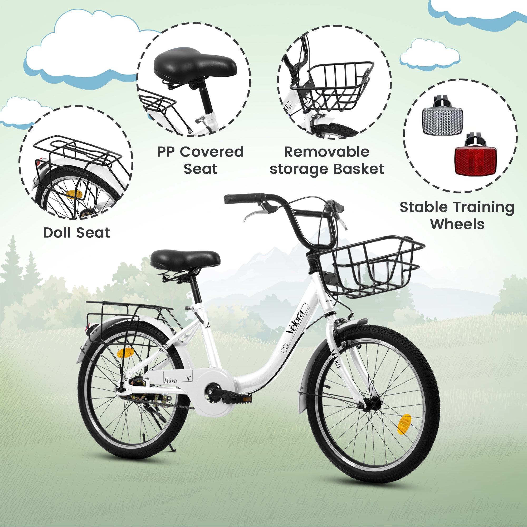 This 20-inch children's bicycle combines safety and durability for young riders aged 6-12. Featuring dual braking systems—a responsive coaster brake and reliable V-brake—it gives kids confidence while learning to ride. The lightweight steel frame balances strength with easy maneuverability, while the chain guard protects clothing and legs. A rear rack adds practical storage for small items or accessories. Available in vibrant pink, green, purple, and white finishes, this single-speed bike is designed for neighborhood cruising and recreational riding without the complexity of gear shifting.
