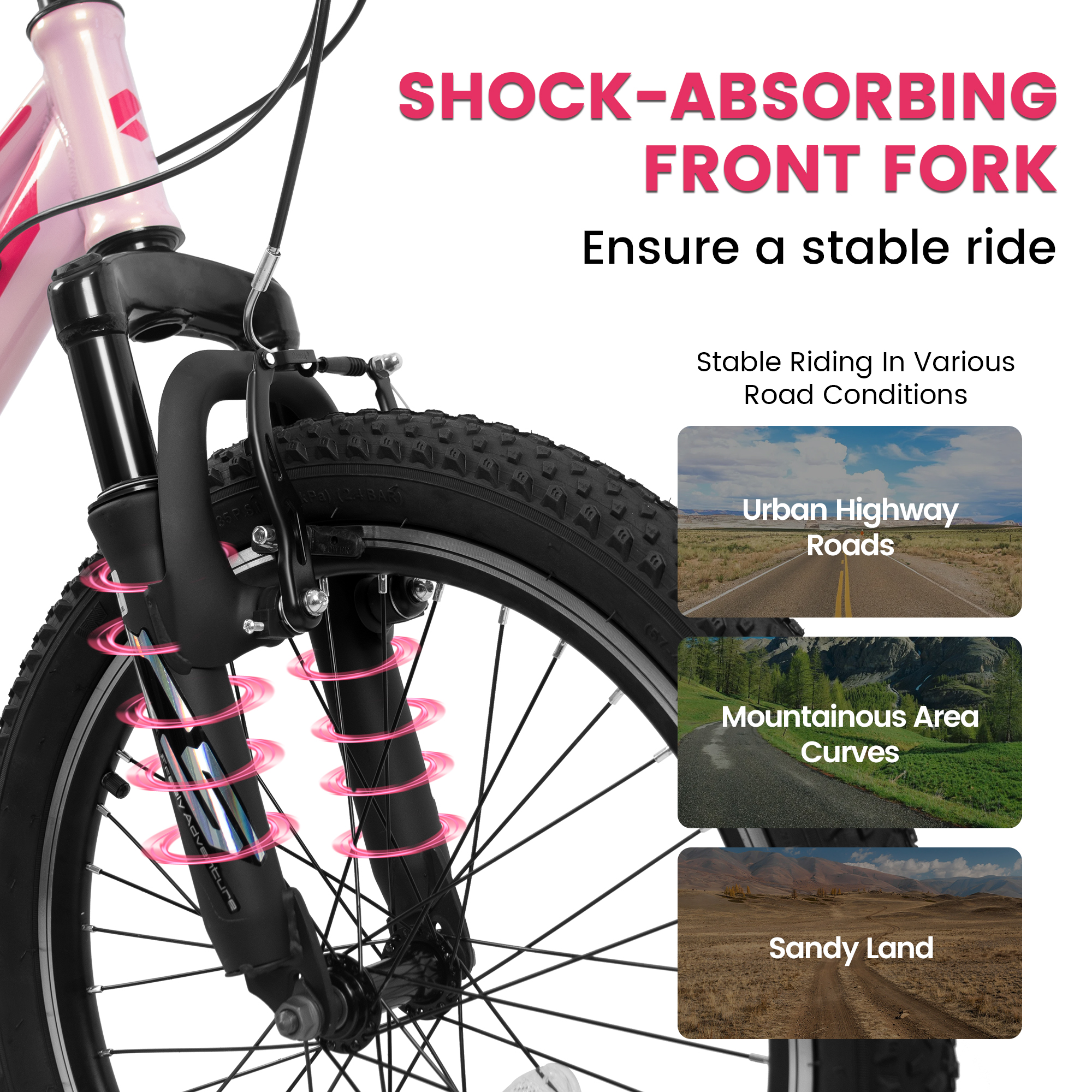 - 【Shock-Absorbing Front Fork for Smooth Rides】Designed with a high-performance shock-absorbing front fork, this 20-inch kids’ bicycle ensures a smooth, comfortable ride on various terrains, making it perfect for outdoor adventures and off-road cycling.