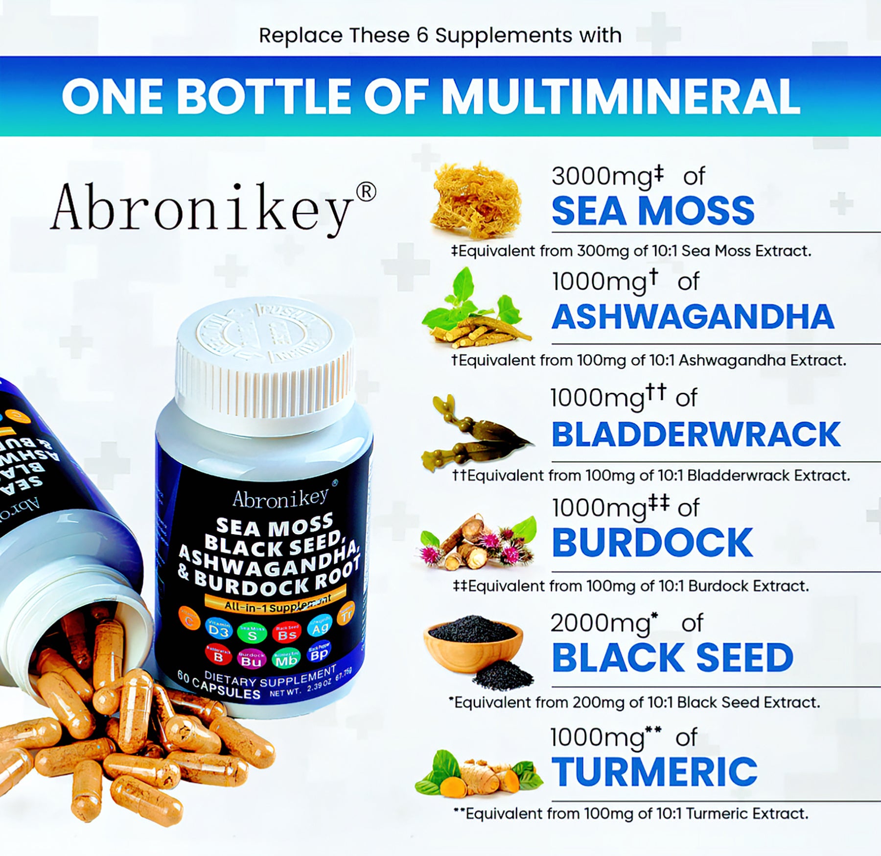Sea Moss capsules with black seed have been combined and the results are amazing.Abronikey has officially created the world's most inclusive 15 in 1 raw sea moss,black seed capsules, ashwagandha extract,bladderwrack root, Burdock roots,turmeric curcumin capsules. The Raw Sea Moss and Black Seed Oil Capsules You've Been Looking For - Abronikey provides 6 full-dose products in one,containing a full lrish Sea Moss Powder,Black SeedPowder,Ashwagandha Extract,Bladderwrack Powder, and Burdock Root Powder in a convenient 2 capsule dosage! Finally, irish sea moss wildcrafted, black seed, ashwagandha powder, bladderwrack herb and burdock root pills have been packed into one convenient solution that's quick and easy to take. Introducing the Abronikey Blend -Sea Moss Pills,Black Seed Oil Pills,Ashwagandha Root,Bladderwrack Capsules and Burdock Root Capsules that contain 10+powerhouse ingredients,turmeric curcumin capsules,Apple Cider Vinegar,ChlorophyII, Manuka Honey, and more! These sea moss bladderwrack burdock root capsules are alternatives to sea moss gummies, black seed oil gummies, and ashwagandha gummies for men. Not usual sea moss raw organic,wildcrafted sea moss gel or ashwagandha supplements. A Powerful Healthy Cell Growth Supplement -Abronikey is overflowing with potent Sea Moss Supplement, Black Seed Oil capsules, Aswagandhada capsules, Burdock Root, Bladderwrack and turmeric powder. Clear out those countless supplements in your supplement cabinet,and replace it with just one seamoss powder, black seeds oil, aswagandhada capsules, and burdock supplement 15-in-1 formula from Abronikey. We made lrish seamoss bladderwrack burdock capsules better by adding black seed. |