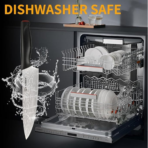 - PREMIUM CRAFTSMANSHIP - Knives are crafted with high carbon stainless steel imported from Germany. After Special process treatment improves characteristics of the steel. It showcases intricate patterns, excellent cutting performance, and remarkable durability. Our knives boasts an official Rockwell hardness rating of HRC 53 ± 1, and the 25-degree hand-polished edge on each side