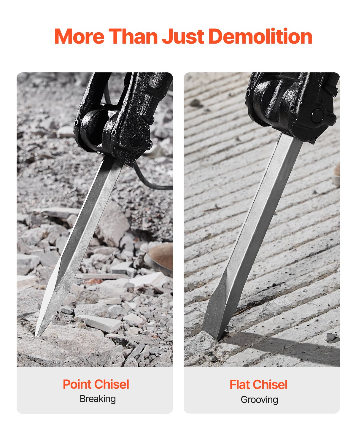 Easy to Handle: The T-shaped handle of our electric jack hammer provides a stable grip for greater control during operation, while the triple shock absorption system significantly reduces vibration, minimizing hand fatigue for a more comfortable working experience.