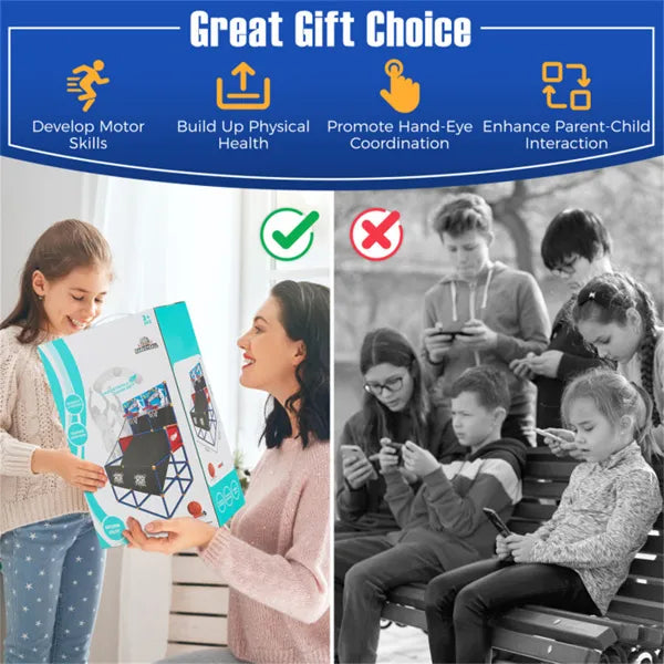 Bring arcade fun home with this Dual Shot Kids Basketball Game, designed for young athletes ages 3 and up. Features two adjustable backboards and hoops for competitive two-player action, encouraging active play and friendly competition. The set includes four durable PVC balls and a hand pump for easy inflation, so kids can start playing immediately. Built with a sturdy frame in eye-catching black, blue, and red colors, this game combines entertainment with physical activity—perfect for indoor play, parties, or family game nights. Ideal for developing coordination, aim, and sportsmanship while keeping children engaged and active.