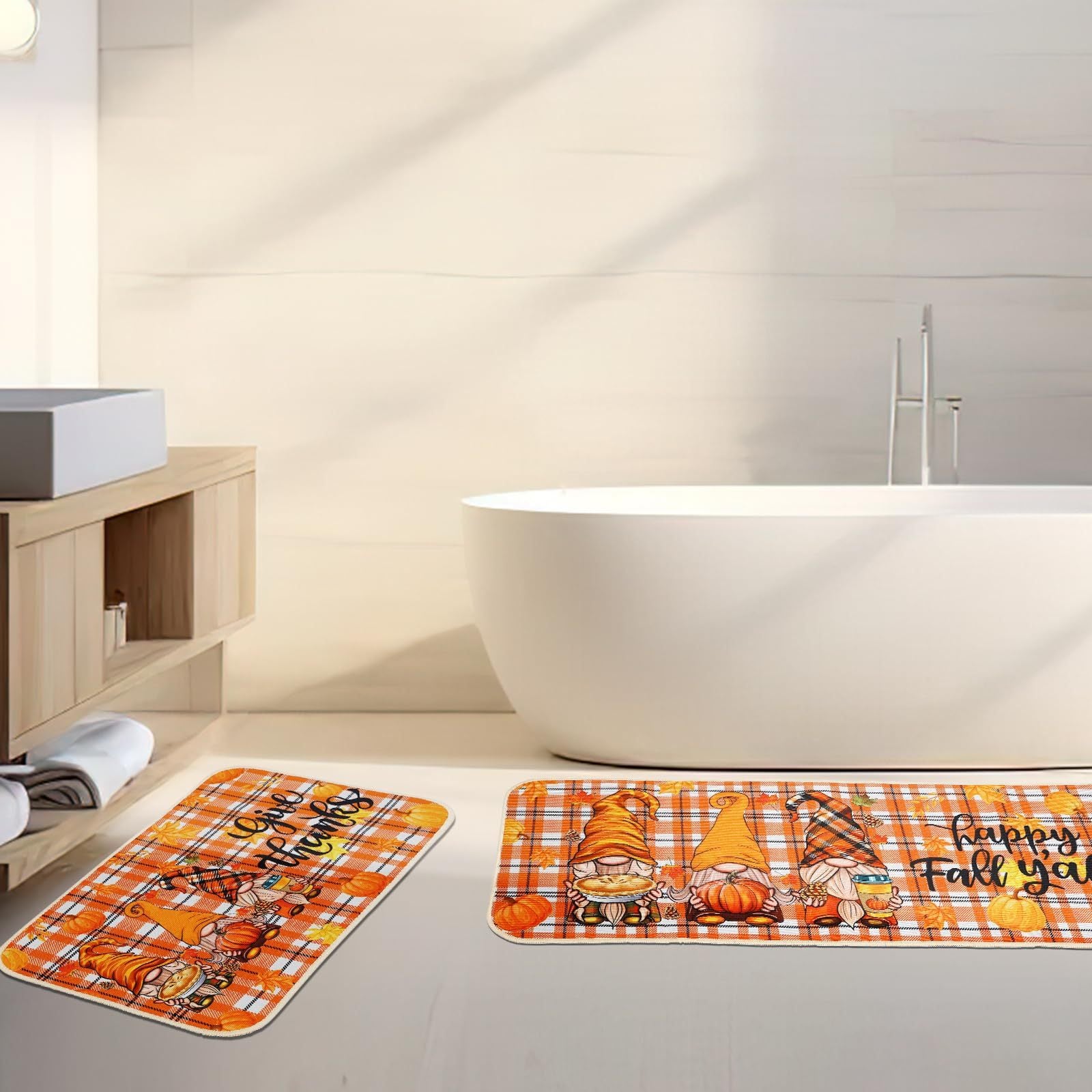 About this productPackaging contents: Our autumn kitchen mats come in 17x29 inches and 17x47 inches to meet your different space needs, such as in the kitchen, sink, bathroom, bedroom, terrace, balcony, dining room, front porch, or laundry room. The autumn kitchen rugs can pair perfectly, making your space neater and more aesthetically pleasing.Non-slip and durable: The autumn kitchen rugs are made of crystal velvet, which is durable and remains as good as new even with frequent use. The back of the autumn kitchen mats and rugs is made of non-slip rubber, which is resistant to deformation and damage, effectively preventing the Thanksgiving kitchen mats from sliding during use, giving you peace of mind.Autumn theme: Our orange kitchen rug features a checkered pattern design that incorporates autumn elements like maple leaves, pumpkins, pine cones, and gnomes, alongside slogans such as "Happy Fall to All" and gratitude, adding a rich autumn atmosphere to your kitchen, making cooking easier and more enjoyable.Easy to clean and use: The autumn kitchen rugs are not only wear-resistant and durable but also have excellent waterproof, oil-proof, moisture-proof, and stain-resistant properties. Additionally, the Thanksgiving kitchen mats are easy to clean and can be vacuumed or machine washed for your convenience.Wide range of uses: Pumpkin decorations can be part of holiday and party decor. Whether it's for Thanksgiving, Halloween, or an autumn-themed party, the autumn kitchen rugs can add warmth and fun to your space.