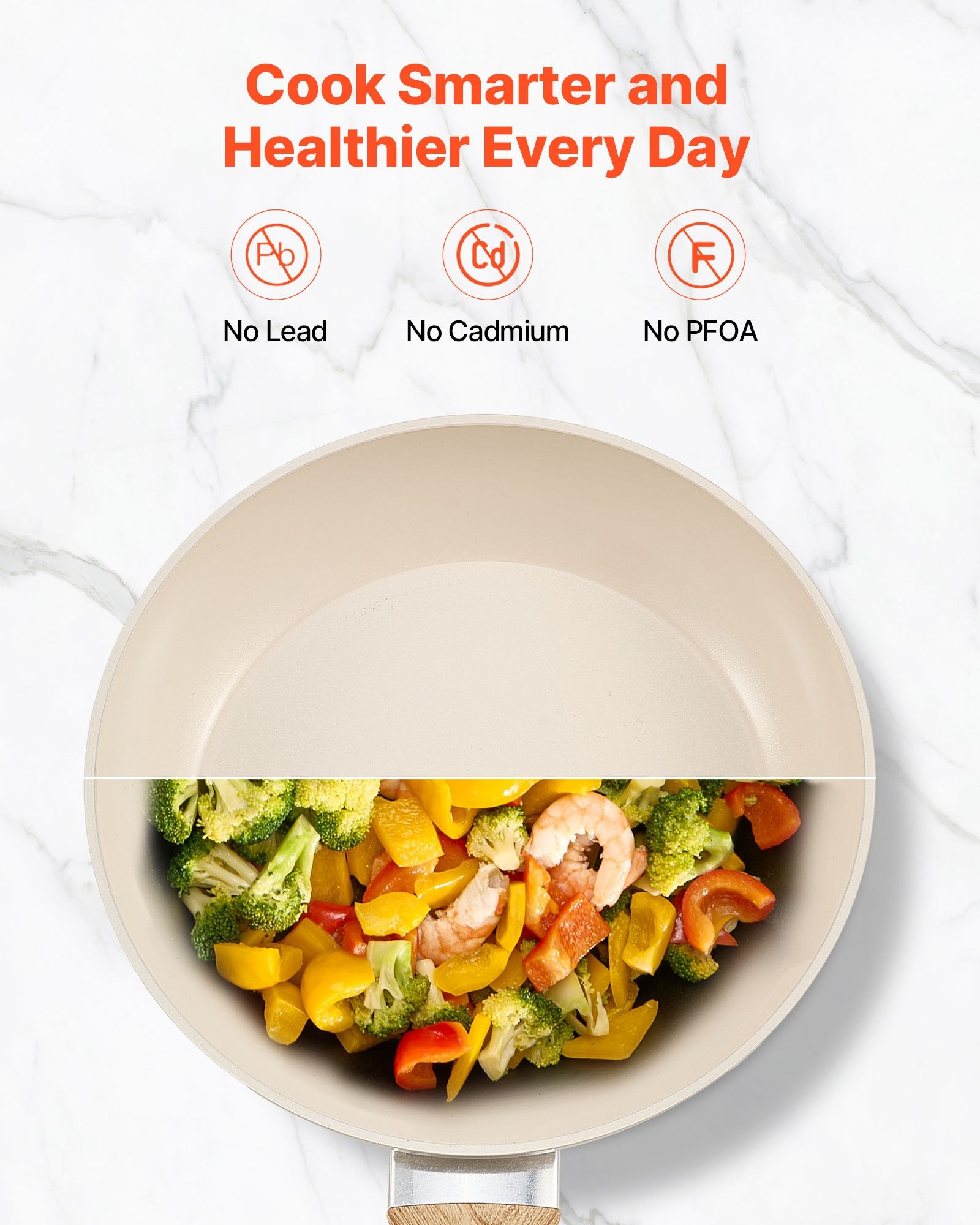 Master your kitchen with this versatile 3-piece frying pan set featuring durable aluminum construction and ceramic nonstick coating. Includes 8-inch, 9.5-inch, and 11-inch skillets designed for everyday cooking and professional meal prep. The heavy-duty ceramic surface resists scratching and maintains its nonstick performance through countless uses. Heat-resistant handles provide safe, comfortable grip during cooking. Compatible with gas, electric, and induction cooktops, making these skillets adaptable to any kitchen setup. The beige finish adds modern elegance to your cookware collection. Perfect for frying eggs, sautéing vegetables, searing meats, and more. Ideal for home chefs seeking reliable, multi-use cookware that delivers consistent results.