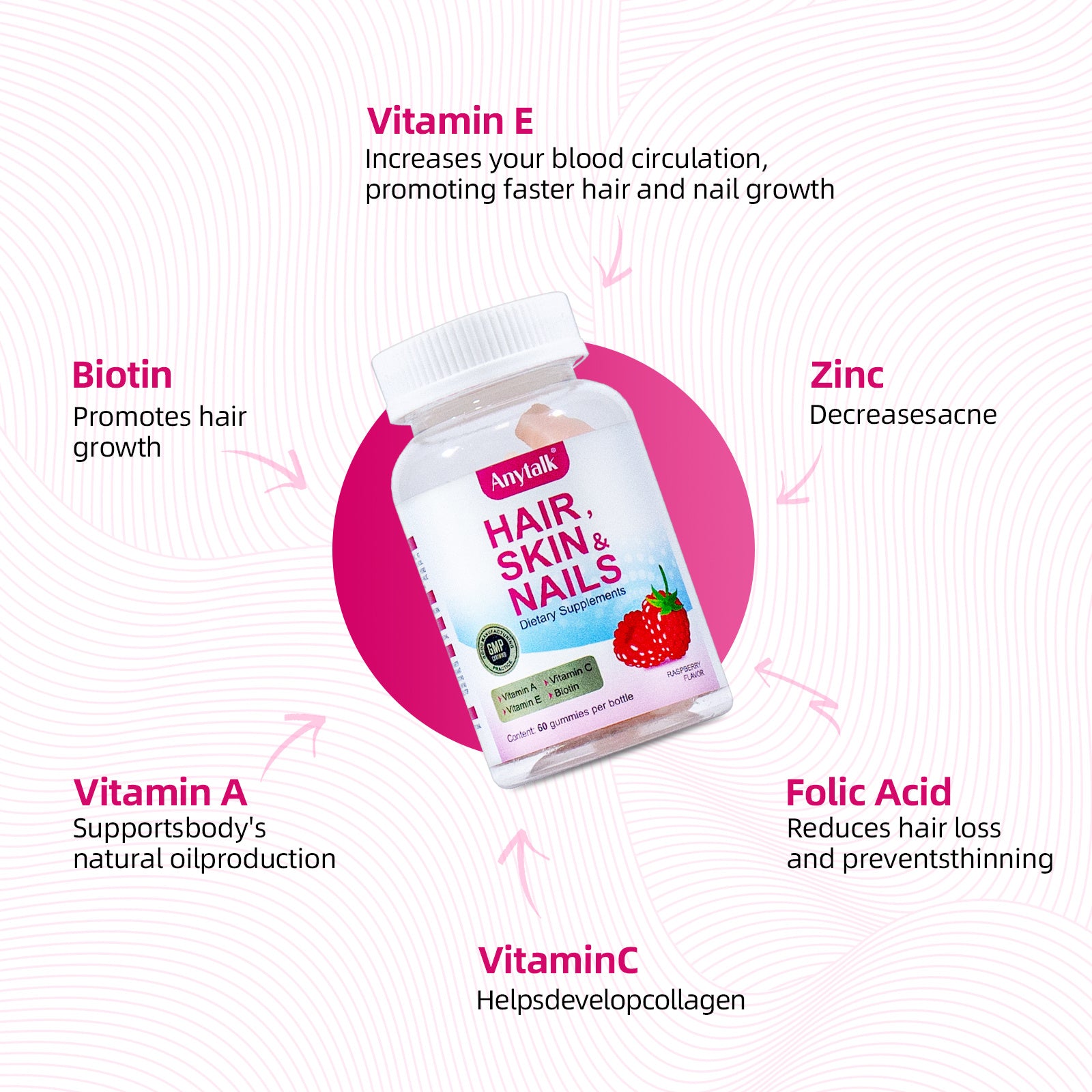 Multi effect integration - supports healthy hair, tough nails, and radiant skin, with vitamins E and C to improve the health of your hair, skin, and nails,