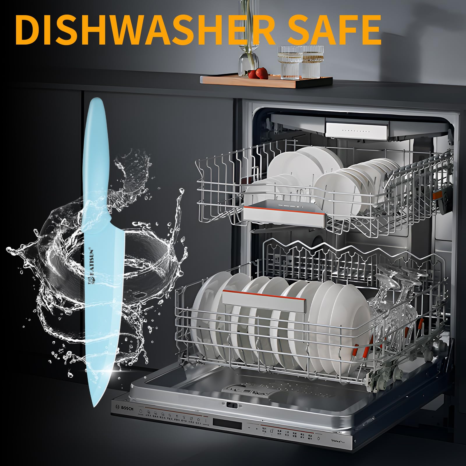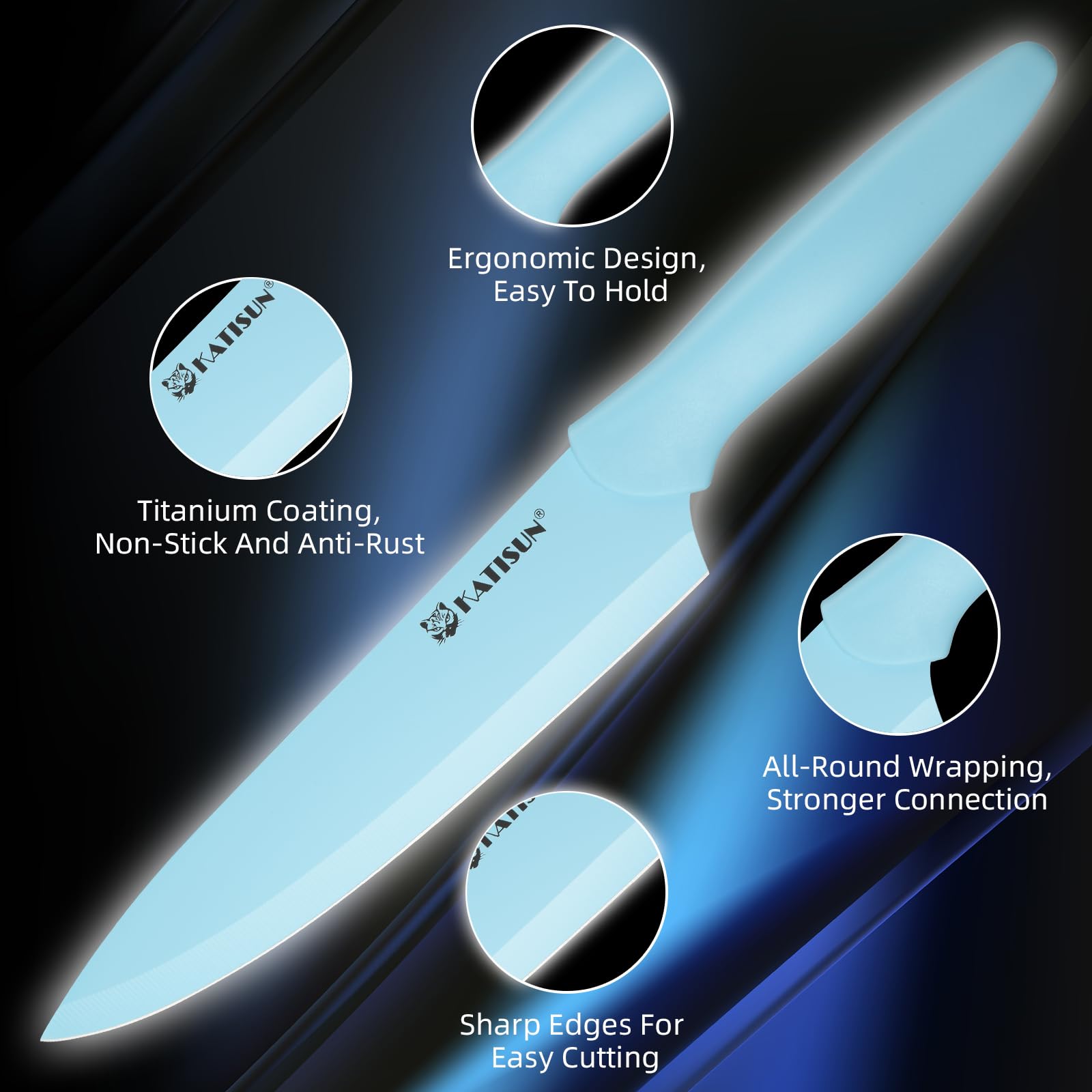 - 【Ergonomic Cyan Handles】The kitchen knife set handles are made of durable and comfortable high-quality PP material with an eye-catching teal color that will add a touch of class to your kitchen. Say goodbye to hand fatigue and hello to efficient, stylish slicing