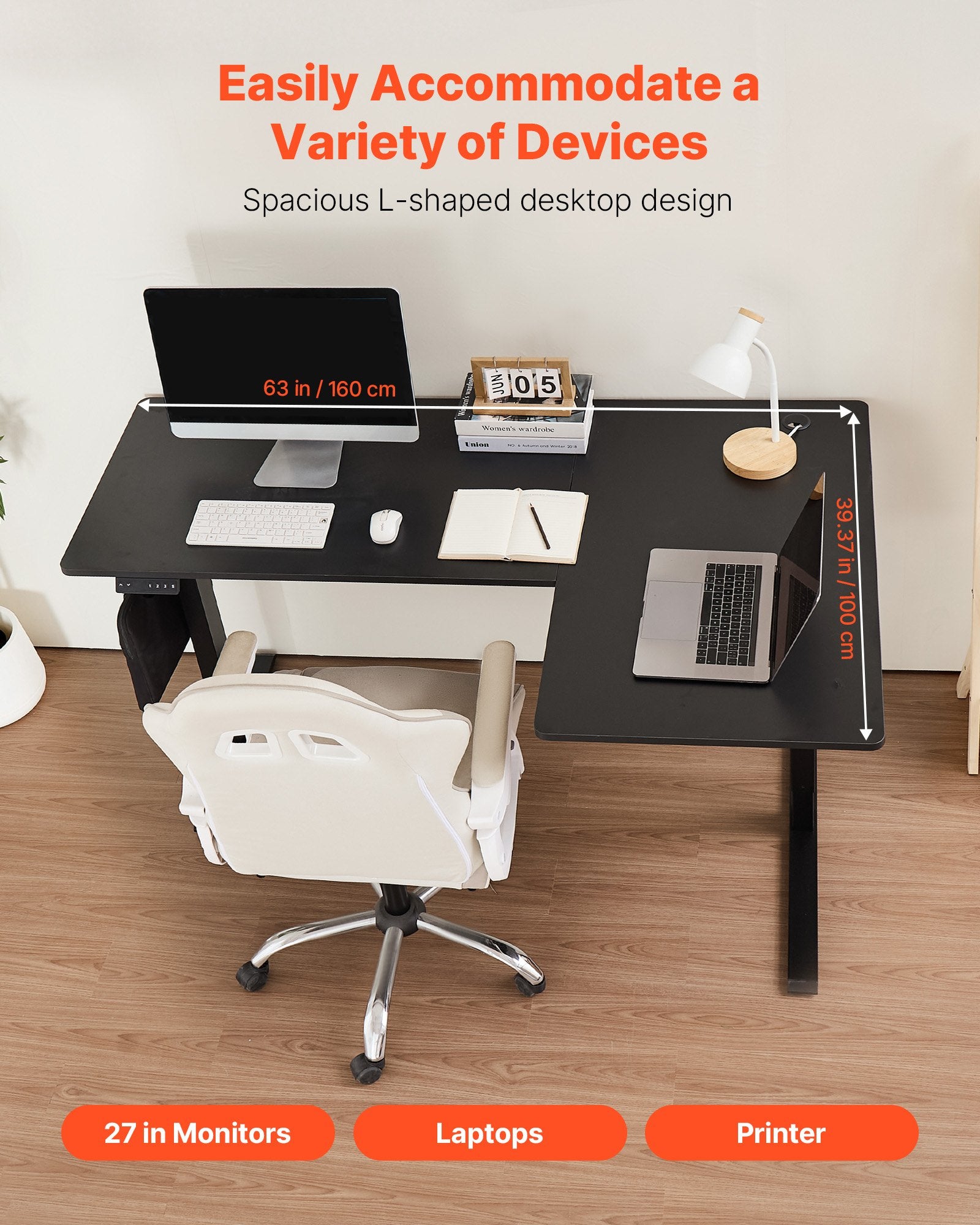 Spacious Workspace: The 63 x 39.37 in / 160 x 100 cm L-shaped gaming desk provides ample space, making it ideal for home offices and gaming. The large surface easily accommodates 2 monitors, 2 laptops, and other office accessories. The flip-layout design ensures maximum space utilization