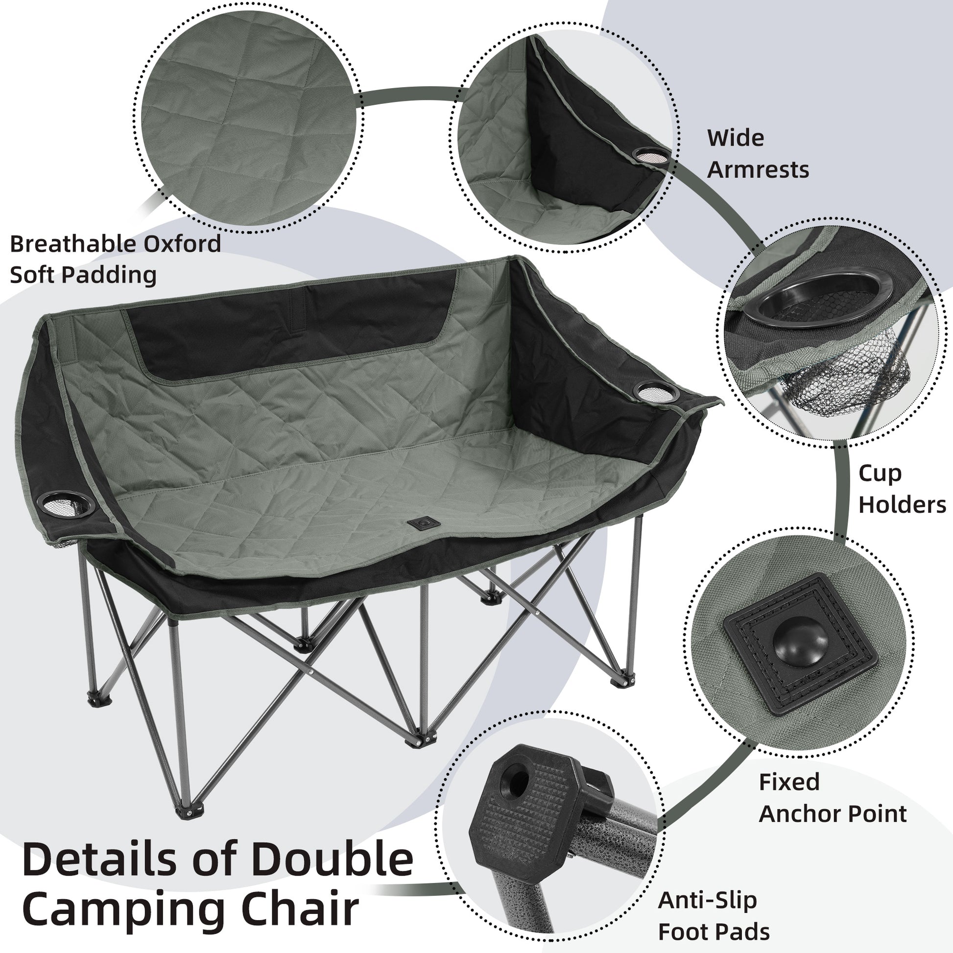 - Extra Wide Double Camping Chair: 58.5 inches from one end to the other, spacious and comfortable for couples, families, or all types of domestic pets.