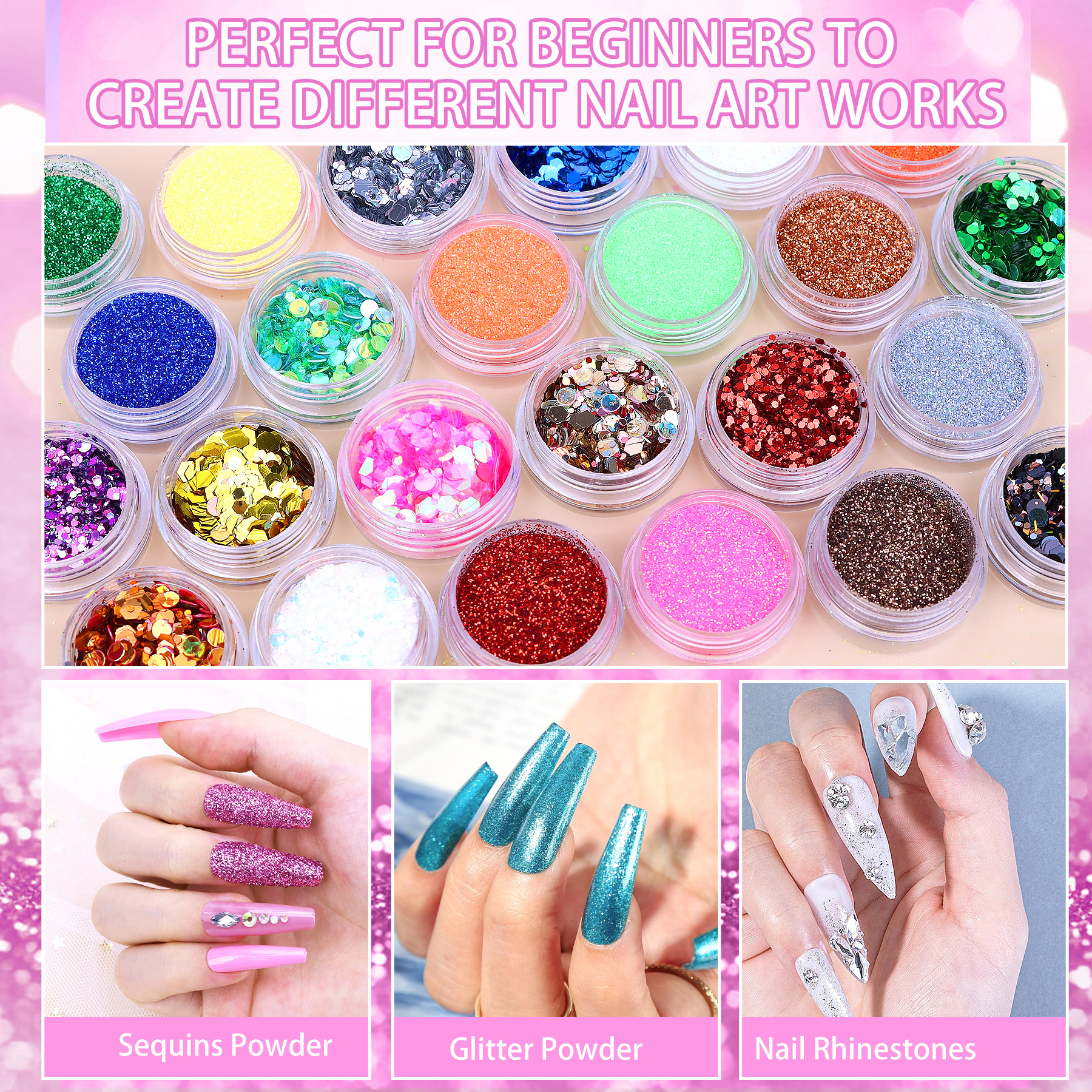 Multi-colored Glitter Powder Nail Set: Acrylic nail set includes 24 colors of glitter and colored nail rhinestones. It has a variety of colors for you to choose from, which allows you to design your nails according to your preferences. Mix the glitter and acrylic powder well, you can diy eye-catching acrylic nail.