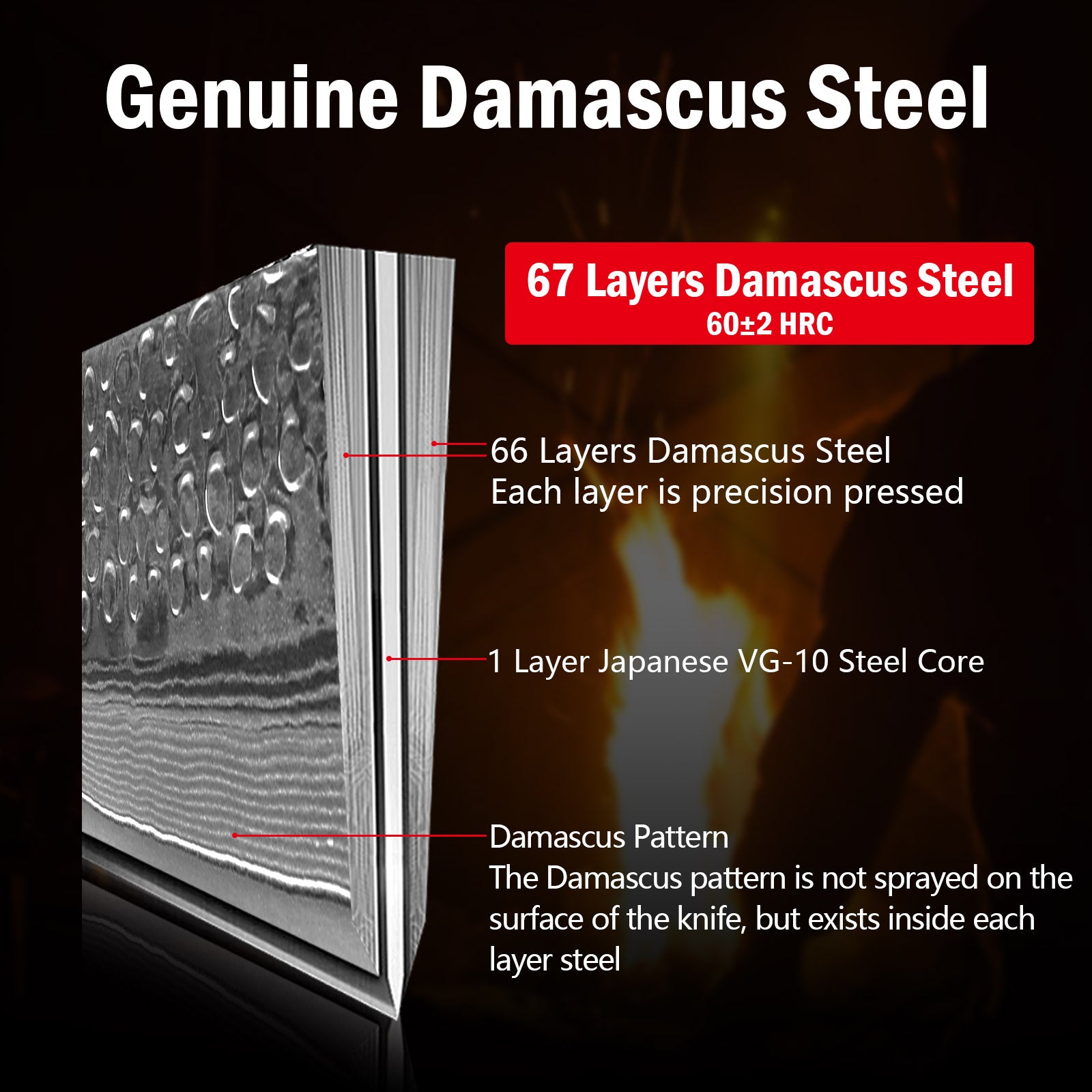- ✔️ULTRA SHARP BLADE:This professional chef's knife is made from 67 layers of Damascus steel with a VG-10 steel core. The blade has been processed by vacuum high temperature and cryogenic processes, and the blade edge has excellent edge retention and is rust-resistant and corrosion-resistant. 66-layer high-carbon stainless steel Damascus steel cladding adds to the aesthetic appeal. HRC 60±2, the edges are not easy to chip or crack.