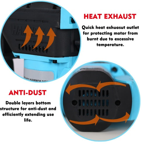- HUMANIZED DESIGN The rotary hammer is designed with your safety and comfort in mind. The safety clutch protection guarantees the safety of your wrist when the hammer is subjected to high torque force. The 360° adjustable handle allows for easy adaptation to different work scenarios, while the upgraded double layer anti-vibration system effectively reduces vibration, minimizing fatigue during extended use. The PU soft grip handle prevents sliding and provides a comfortable grip.