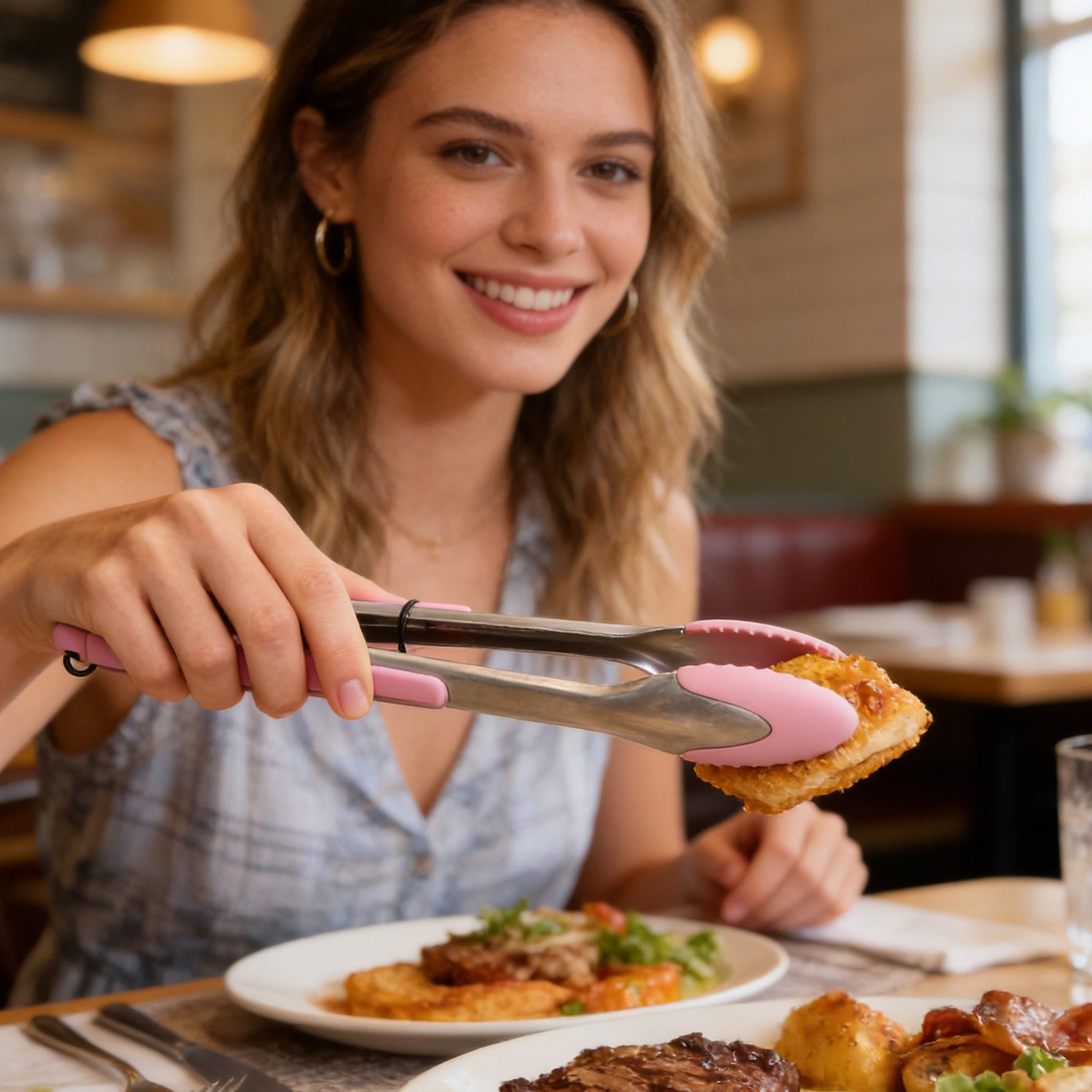 Stainless steel kitchen tongs designed for versatile cooking tasks. These durable tongs feature a secure grip handle and reliable locking mechanism, making them ideal for grilling, frying, and food preparation. The non-slip design ensures safe handling of hot foods and cookware. Perfect for both home cooks and professional kitchens, these tongs offer dependable performance and long-lasting quality. A practical addition to any kitchen utensil collection.
