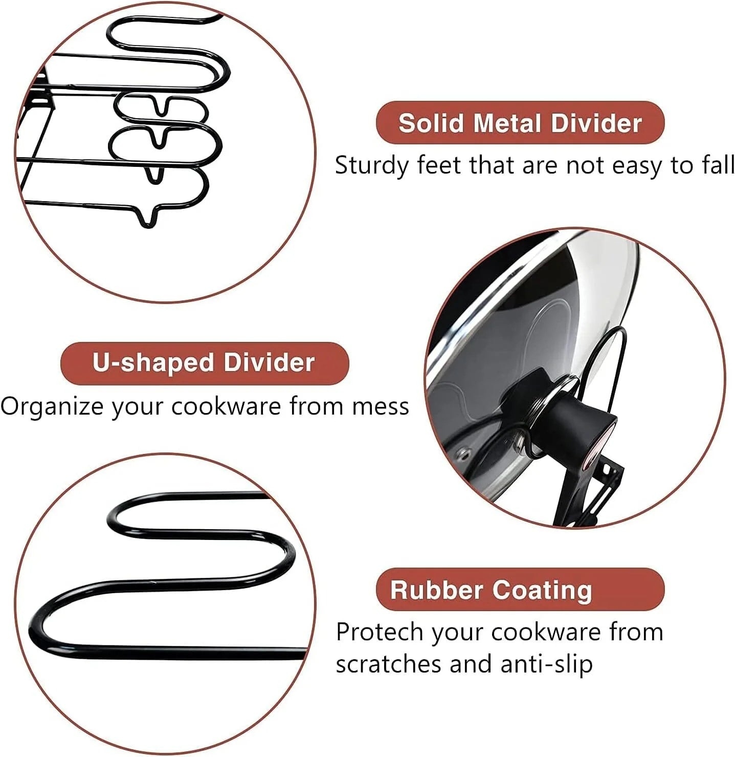 - Versatile Storage: Our pot and pan organizer features adjustable tiers, allowing you to customize the height for different sizes of cookware, ensuring everything from large pots to smaller pans fits seamlessly.