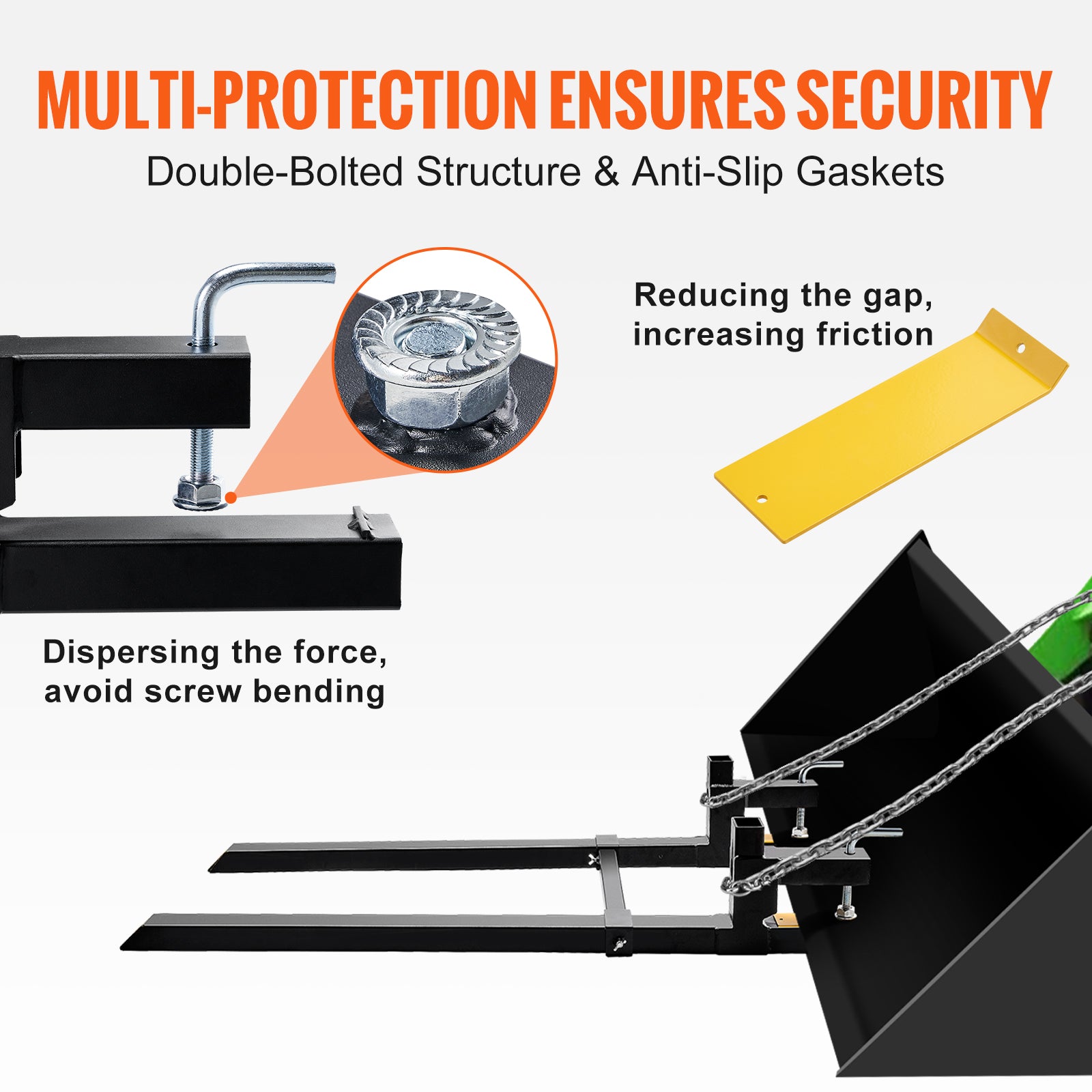 Pallet Forks deliver robust lifting capacity with a 2000 lbs weight rating, engineered for demanding agricultural and industrial applications. The clamp-on design attaches securely to tractor buckets, skid steers, and loader attachments without permanent modification. An adjustable stabilizer bar enhances load control and prevents shifting during transport, while heavy-duty construction ensures durability across extended use. Ideal for moving pallets, hay bales, and bulk materials on farms, construction sites, and warehouses. Compatible with most standard bucket widths for versatile equipment integration.
