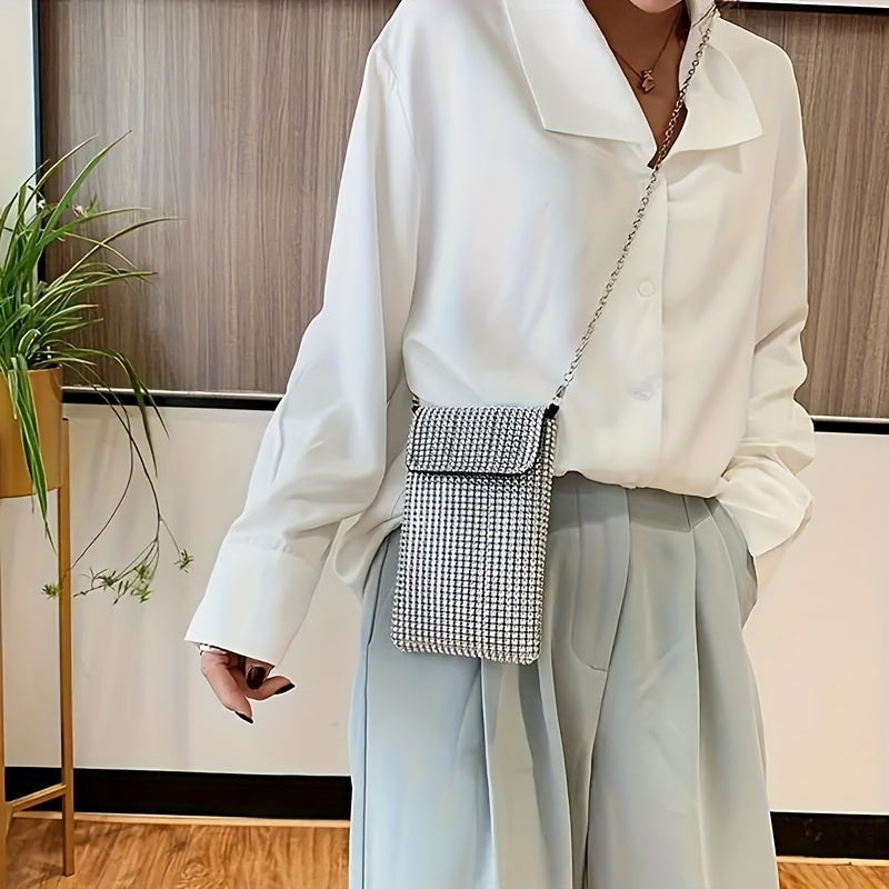 Elevate your evening look with this sophisticated crossbody bag, expertly crafted with shimmering glitter, rhinestone accents, and sequin detailing. Perfect for weddings, formal events, or special occasions, this versatile handbag combines glamorous aesthetics with practical functionality. The compact design accommodates your cell phone, wallet, and essentials while the adjustable crossbody strap ensures comfortable, hands-free wear. Whether you're attending a gala or night out, this statement piece delivers refined elegance and sparkle that complements any formal ensemble.